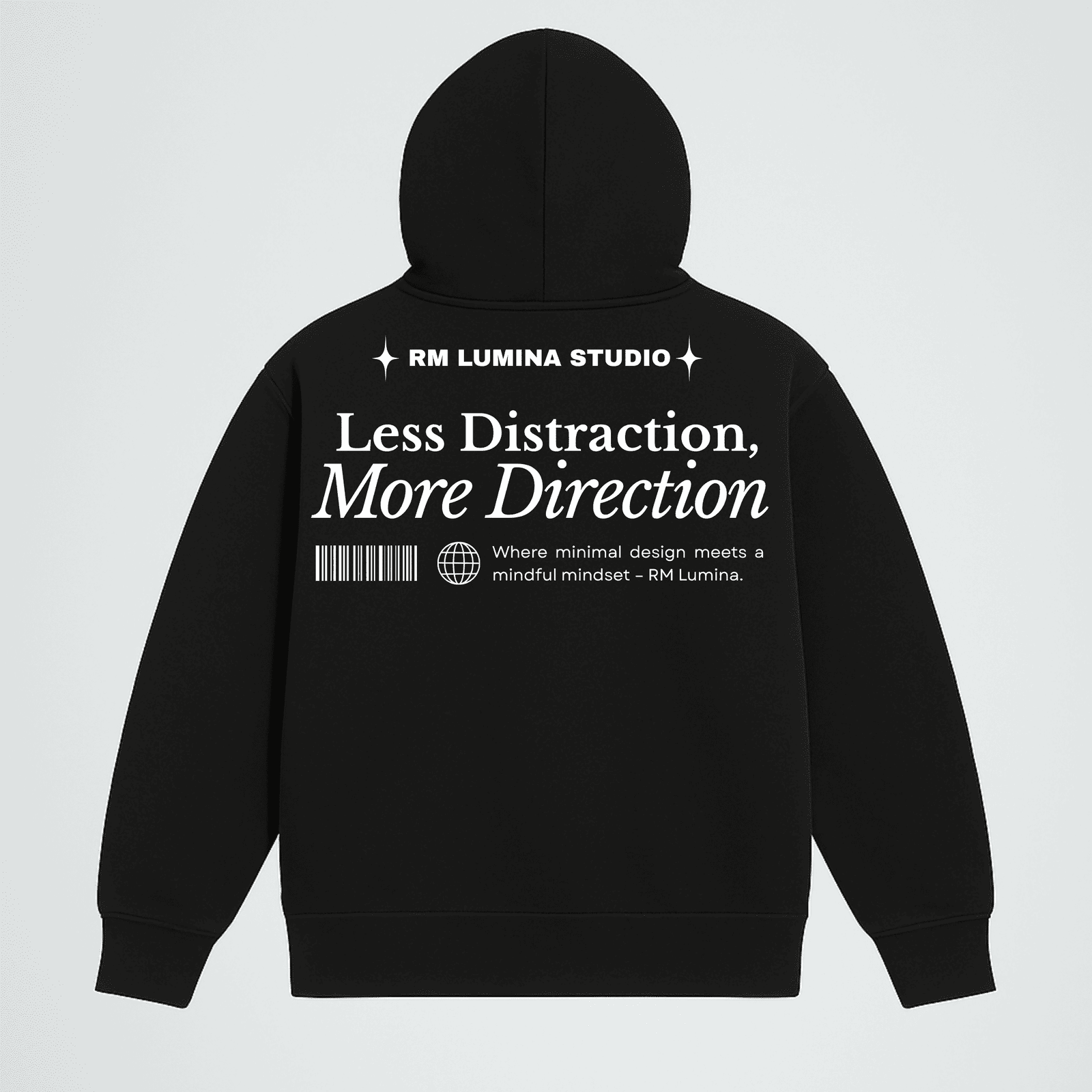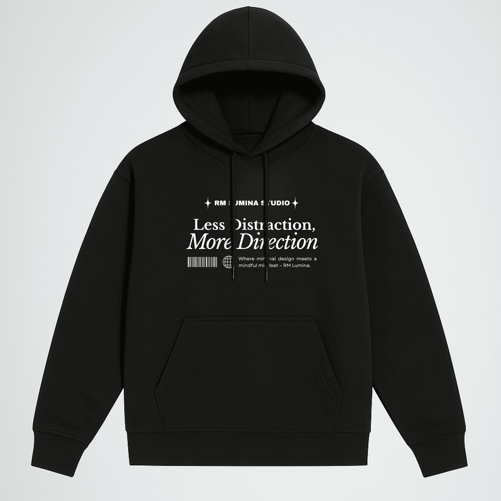 Step into clarity and confidence with the RM Lumina Studio hoodie — where minimal design meets a mindful mindset. Featuring our bold statement “Less Distraction, More Direction” across the chest and back, this premium black hoodie is a daily reminder to stay focused and intentional.