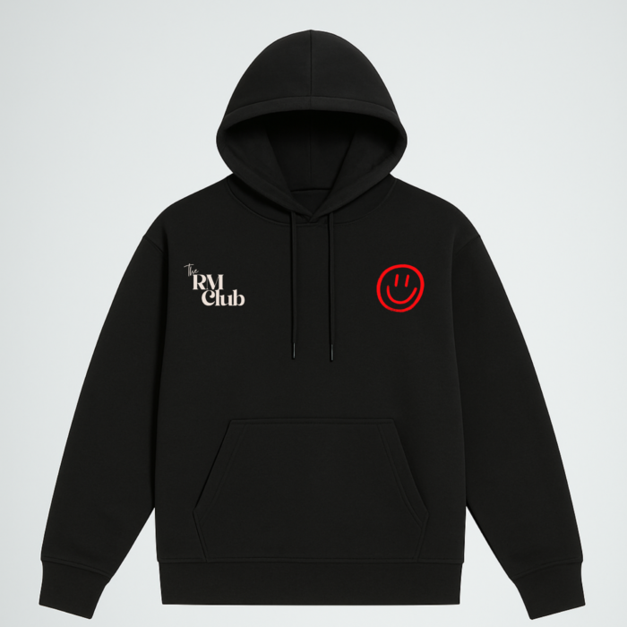 The back showcases a hand-drawn smiley face and “Soulful Thoughts” typography, representing positivity, inner peace, and individuality. On the front, the RM Club logo and subtle smiley detail keep the design minimal yet expressive.